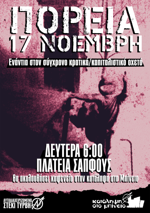 Μέσα στο στρατιωτικοποιημένο και εντεινόμενο καθεστώς καταστολής, δημιουργούμε αλυσίδες αντίστασης και ανάσες ελευθερίας. Καταλήψεις, συλλογικότητες, ατομικότητες, σωματεία βάσης επιλέγουν έναν δρόμο αντίθετο στην ηττοπάθεια, τη σιωπή και το συμβιβασμό που επικρατεί. Προτάσσουμε την αυτοοργάνωση και τις συλλογικές απαντήσεις στις επιθέσεις που εξαπολύει το κράτος.