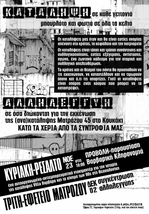 Κυριακή 23 Νοέμβρη, 6μμ στον αυτοοργανωμένο χώρο αλληλεγγύης & ρήξης, Ρεσάλτο (Έβρου 27, Ταμπούρια-Κερατσίνι, 100μ. από την πλατεία Λαού):