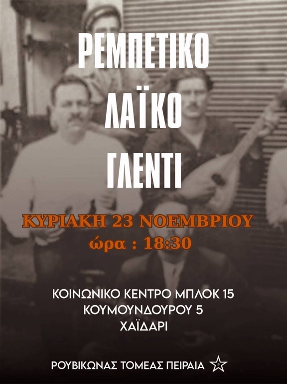 Ρεμπέτικο - Λαϊκό γλέντι οικονομικής ενίσχυσης στο Κοινωνικό κέντρο «Μπλοκ 15» στο Χαϊδάρι (Κουμουνδούρου 5)