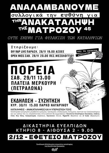 λληλεγγύη στις διωκόμενες αγωνίστριες/στές της κατάληψης ματρώζου 45 σε όλες τις καταλήψεις και τις δομές αγώνα