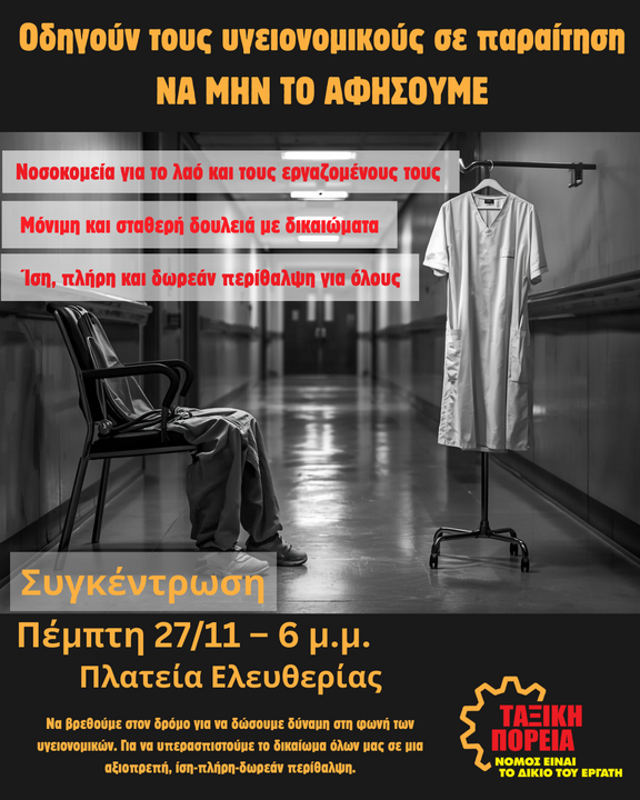 Η υγεία είναι αγαθό και η περίθαλψη λαϊκό δικαίωμα. Δεν είναι εμπόρευμα, δεν είναι πολυτέλεια, δεν μπορεί να εξαρτάται από το πορτοφόλι κανενός. Πρωτοβάθμια περίθαλψη και κέντρα υγείας ουσιαστικά δεν υπάρχουν και οι ασθενείς αναγκάζονται να συρρέουν στα επείγοντα. Τα νοσοκομεία και τα κέντρα υγείας της χώρας βρίσκονται σε οριακό σημείο: ελλείψεις προσωπικού, αναμονές που μετατρέπουν την περίθαλψη σε άθλο. Πίσω από κάθε μία από αυτές τις δυσκολίες βρίσκονται άνθρωποι - οι εργαζόμενοι της υγείας και οι ασθενείς.