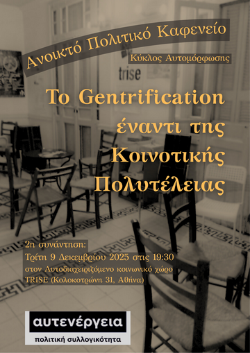 Στο πλαίσιο των ανοιχτών πολιτικών καφενείων που διοργανώνει η ομάδα Αυτενέργεια στον αυτοδιαχειριζόμενο κοινωνικό χώρο Τρισέ, η δεύτερη συνάντηση θα αποτελέσει τη συνέχεια και ολοκλήρωση της θεματικής «Το Gentrification έναντι της Κοινοτικής Πολυτέλειας». Αφού, στην πρώτη μας συζήτηση, χαρτογραφήσαμε τις βασικές έννοιες του gentrification, το μεσογειακό μοντέλο και τις χωρικές συνεπαγωγές της κοινοτικής πολυτέλειας, στη δεύτερη συναντιόμαστε για να εξετάσουμε το ζήτημα από τη σκοπιά των κινημάτων πόλης και των πρακτικών αντίστασης.
