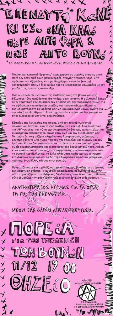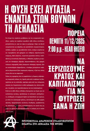 Κάλεσμα της «Πρωτοβουλίας αναρχικών συλλογικοτήτων ενάντια στη λεηλασία της φύσης» στην πορεία για την υπεράσπιση των βουνών 11/12 στις 19:00 ΗΣΑΠ Θησείο