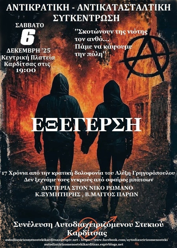 Δεκαεφτά χρόνια έχουν περάσει από εκείνο το βράδυ της 6ης Δεκέμβρη του 2008 ,το βράδυ που ο 15χρονος Αλέξης Γρηγορόπουλος δολοφονείται από τους ένστολους μισθοφορικούς φασίστες Κορκωνέα, Σαραλιώτη και το ξέσπασμα της αυθόρμητης εξέγερσης.Η σημερινές συνθήκες θα μπορούσαν να πυροδοτήσουν ένα νέο κύκλο εξεγερσιακών καταστάσεων πράγμα το οποίο δεν βλέπουμε. Δεν πρέπει όμως να βυθιστούμε σε μια λογική ηττοπάθειας ,αλλά σε μια λογική επαγρύπνησης, να προβληματιστούμε ,να ανασκουμπωθούμε ,να σηκώσουμε κεφάλι απέναντι στον κρατικό μηχανισμό και τα τσιράκια του και κάθε φορά που δείχνουν τα δόντια τους ,είναι ιστορικό μας καθήκον και ευχαρίστησή μας να τους τα σπάσουμε, να ανασυνταχθούμε και να κρατήσουμε το όραμα της εξέγερσης ζωντανό ,για τώρα και για πάντα μέχρι την καταστροφή του υπάρχοντος για μια κοινωνία ελεύθερη χωρίς δυνάστες.