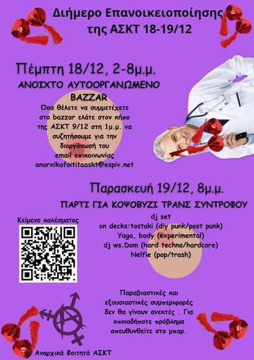 Σας καλούμε όλα σε ένα ανοιχτό Bazaar, την Πέμπτη 18/12 και στο Party οικονομικής ενίσχυσης για φυλομετάβαση συντρόφου, την Παρασκευή 19/12, στο πλαίσιο ενός διημέρου επανοικιοποίησης των χώρων της ΑΣΚΤ χωρίς εταιρίες, κομματικές παρατάξεις και καθηγητάδες. Θέλουμε να δράσουμε ελεύθερα, αυτοοργανωμένα , ενάντια σε θεσμικούς περιορισμούς και να επαναδιαπραγματευτούμε συλλογικά την δομή της οικονομίας ως έχει. Όσα θέλετε να συμμετέχετε στο bazzar ελάτε στον κήπο της ΑΣΚΤ, την Τρίτη 9/12 στη 1μ.μ. να συζητήσουμε για την διοργάνωσή του.