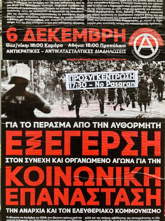 Η 6η Δεκέμβρη παραμένει βαθιά χαραγμένη στη συλλογική μνήμη, καθώς η δολοφονία του Αλέξη Γρηγορόπουλου σηματοδότησε μια ολόκληρη περίοδο εξέγερσης, αυτοοργάνωσης και κοινωνικής αντίστασης και αυτά ακριβώς τα χαρακτηριστικά είναι που θέλει το κράτος να σβήσει και να καταστείλει. Η σταθερή παρουσία των αναρχικών στο δρόμο τη μέρα της 6ης Δεκέμβρη και οι διαδηλώσεις, ως βασική έκφραση συλλογικής δύναμης, αποκτούν ιδιαίτερη σημασία σε μια εποχή εντεινόμενης επιτήρησης και περιορισμών. Αναπόσπαστο κομμάτι της οργανωμένης παρουσίας μας στο δρόμο είναι η και η οργανωμένη παρουσία μας σε ανοιχτά καλέσματα για τη συγκρότηση των διαδηλώσεων με τους δικούς μας όρους και όχι με αυτούς που θέλει να επιβάλλει το κράτος και η αστυνομία. Για να ανακτήσουμε τα χαμένα εδάφη, δίνουμε την υπόσχεση πως με οργάνωση, συνέπεια και ανυποχώρητο αγώνα θα βρισκόμαστε στην πρώτη γραμμή σύγκρουσης με την εξουσία - μέχρι να τα πάρουμε όλα πίσω.