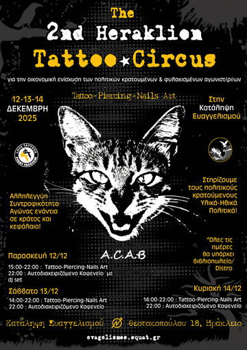 The 2nd Heraklion Tattoo Circus (tattoo, piercing, nails art) στην Κατάληψη Ευαγγελισμού για την οικονομική ενίσχυση των πολιτικών κρατουμένων και φυλακισμένων αγωνιστ(ρι)ών.