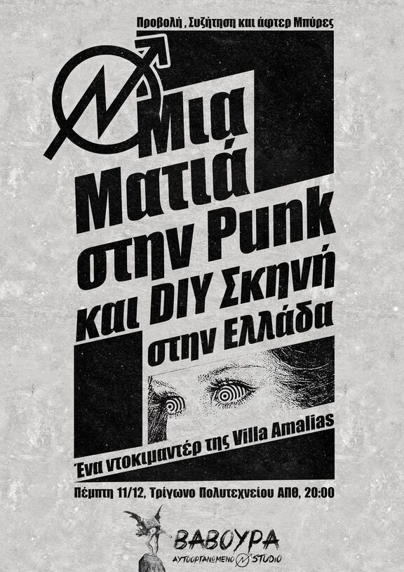Κάνουμε ένα οπτικοακουστικό οδοιπορικό στην ελληνική punk και DIY σκηνή μέσα από το ντοκιμαντέρ της villa Amalias που γυρίστηκε κατά την περίοδο 2005 - 2007. Ένα ντοκιμαντέρ βασισμένο πάνω στα πολιτικά επίδικα, τους προβληματισμούς και τις διεξόδους της σκηνής ανά τα χρόνια σε διάφορους χώρους και πόλεις. Μετά την προβολή θα ακολουθήσει συζήτηση πάνω σε ότι μας προβλημάτισε το ντοκιμαντέρ αλλά και σε συνδυασμό με την κατάσταση που υπάρχει σήμερα στην σκηνή. Στον χώρο θα υπάρχει distro και θα ακολουθήσουν μπυράκια για την οικονομική ενίσχυση της δομής.