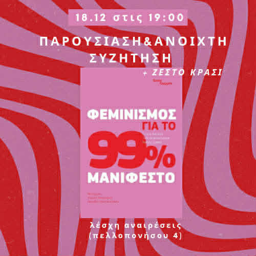 Στις 18 Δεκεμβρίου το απόγευμα συναντιόμαστε στην Λέσχη Αναιρέσεις για να παρουσιάσουμε το πλέον πολυσυζητημένο Μανιφέστο για τον φεμινισμό του 99%. Σε μια περίοδο όπου οι επιθέσεις του κεφαλαίου είναι πολλαπλές και πολυμέτωπες, που η ακρίβεια οργιάζει σε βάρος των λαϊκών στρωμάτων, που το 13ωρο γίνεται νόμος, την ίδια στιγμή που το εργατικό κίνημα δεν φαίνεται να μπορεί να βάλει ανάχωμα, λόγω των εργοδοτικών λογικών στις οποίες υποτάσσεται, επιλέξαμε να ξαναεπισκεπτούμε το βιβλίο που μιλάει για τον φεμινισμό των πολλών, για το φεμινισμό της εργατικής τάξης, για τον φεμινισμό του 99%. Θέλουμε να εμπνευστούμε από τους αγώνες των συντροφισσών στην Ιταλία και την Ισπανία ενάντια στην πατριαρχία και την έμφυλη καταπίεση στην εργασία, από τις μαχητικές απεργίες τους για να μπορέσουμε να φανταστούμε ένα φεμινισμό στο σήμερα κόντρα σε δικαιωματίστικες φιλελεύθερες λογικές. Εμείς αρνούμαστε να παραδώσουμε το φεμινιστικό κίνημα σε όσες οραματίζονται την χειραφέτηση μέσα στο όρια του συστήματος.