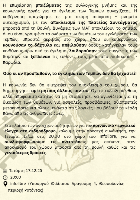 Στο πλαίσιο των ανοιχτών συζητήσεων για τον κοινωνικό - εργατικό έλεγχο στο σιδηρόδρομο, καλούμε στην προσεχή συνάντηση, την Τετάρτη 17/12 στις 20.00 στο χώρο του Infolibre, για να συνδιαμορφώσουμε τις αντιστάσεις μας απέναντι στον αποκλεισμό του χώρου μπροστά από τη Βουλή καθώς και τις γενικότερες δράσεις.