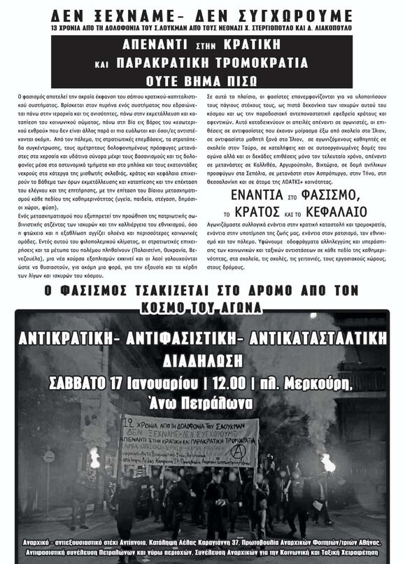 Στηρίζουμε τα καλέσματα το Σάββατο 17/01, στην Πλατεία Μερκούρη στις 12:00 στην αντιφασιστική πορεία για την δολοφονία του Σαχτζάτ Λουκμάν πριν απο 13 χρόνια στην περιοχή των Πετράλωνων.