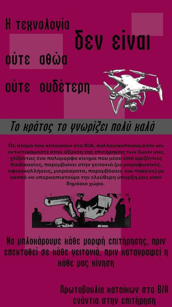 Ως άτομα που κατοικούν στα Β/Α, συλλογικοποιούμαστε και αντιστεκόμαστε στην όξυνση της επιτήρησης των ζωών μας, χτίζοντας ένα πολύμορφο κίνημα που μέσα από οριζόντιες διαδικασίες, παρεμβαίνει στην γειτονιά (με μικροφωνικές, αφισοκολλήσεις, μοιράσματα, παρεμβάσεις στο δημοτικό συμβούλιο και πορείες) με σκοπό να υπερασπιστούμε την ελεύθερη ύπαρξη μας στον δημόσιο χώρο.