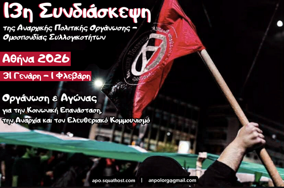 Η 13η Συνδιάσκεψη της Αναρχικής Πολιτικής Οργάνωσης (ΑΠΟ) | Ομοσπονδίας Συλλογικοτήτων θα πραγματοποιηθεί το διήμερο 31 Γενάρη -1η Φλεβάρη 2026 στην Αθήνα.
