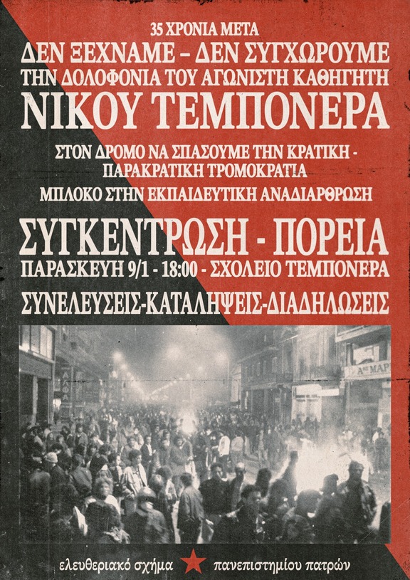 35 χρόνια πέρασαν από την νύχτα που οι τραμπούκοι του κυβερνητικού παρακράτους, η συμμορία των Καλαμπόκα-Σπίνου-Μαραγκού, δολοφόνησαν τον καθηγητή Νίκο Τεμπονέρα κατά την έφοδό τους στο υπό κατάληψη σχολικό συγκρότημα Βουδ. Ο Νίκος Τεμπονέρας μαζί με συναδέλφους του δεν δίστασε όταν αντίκρισε τους την ΟΝΝΕΔίτικη συμμορία, στάθηκε όρθιος για να προστατέψει τους μαθητές και τον αγώνα τους ενάντια στις αντιδραστικές μεταρρυθμίσεις Κοντογιαννόπουλου, από το μένος της κρατικής και παρακρατικής βίας. Ο Νίκος Τεμπονέρας με αυτήν του την θυσία θα παραδώσει για τελευταία φορά το ουσιαστικότερο μάθημα στους μαθητές του, τους συναδέλφους του, σε ολόκληρο τον λαό. Μια θυσία, που όσα χρόνια και αν πέρασαν, συνεχίζει να εμπνέει λαό και νεολαία!