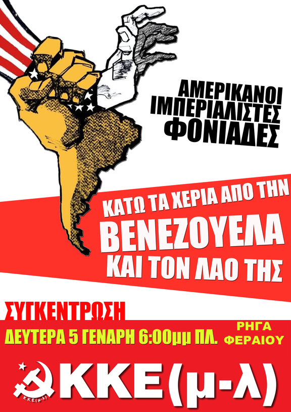 Η οργάνωση Τρικάλων του ΚΚΕ(μ-λ) καλεί τον λαό της πόλης να καταδικάσει την νέα εγκληματική επίθεση του αμερικάνικου ιμπεριαλισμού διαδηλώνοντας την αλληλεγγύη του στον λαό της Βενεζουέλας!