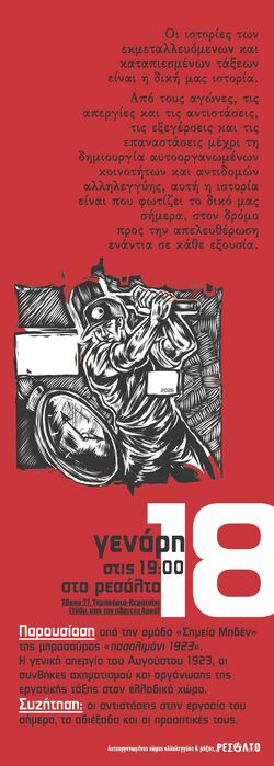 - Κυριακή 18 Γενάρη, 7μμ, στο Ρεσάλτο: Παρουσίαση από την ομάδα "Σημείο Μηδέν" της μπροσούρας "Πασαλιμάνι 1923". Η γενική απεργία του Αυγούστου 1923, οι συνθήκες σχηματισμού και οργάνωσης της εργατικής τάξης στον ελλαδικό χώρο. Συζήτηση: οι αντιστάσεις στην εργασία του σήμερα, τα αδιέξοδα και οι προοπτικές τους.