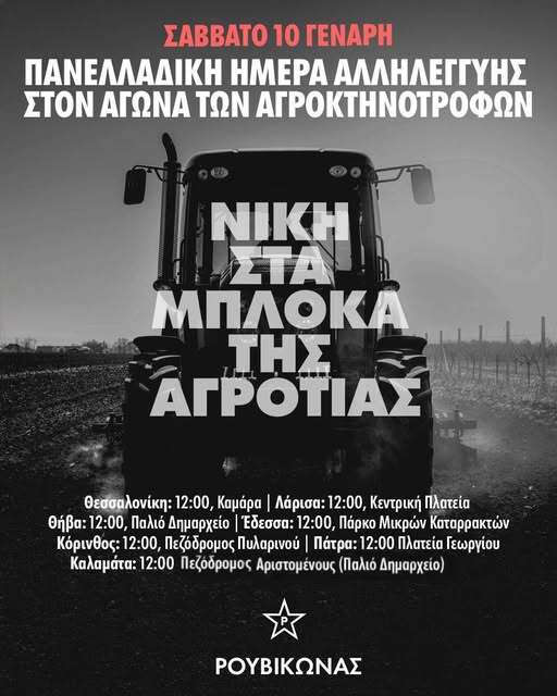 Σάββατο 10 Γενάρη Πανελλαδική Ημέρα Αλληλεγγύης στον αγώνα των αγροκτηνοτρόφων