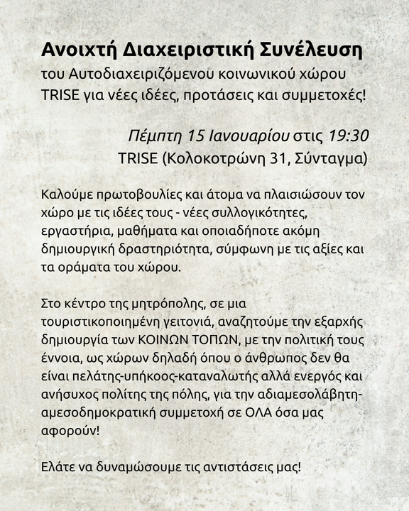 Ανοιχτή Διαχειριστική Συνέλευση του Αυτοδιαχειριζόμενου κοινωνικού χώρου TRISE για νέες ιδέες, προτάσεις και συμμετοχές!