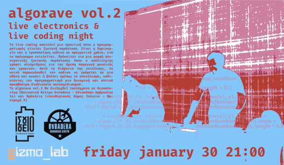 Το algorave vol.2 θα διεξαχθεί ταυτόχρονα σε Θεσσαλονίκη (Κοινωνικό Κέντρο Ovradera - Επισκόπου Αμβροσίου 14) και Ηράκλειο (Ελευθεριακός Χώρος Ισόγειο - Μαστραχά 9)