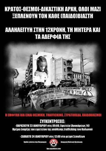 Καλούμε πολιτικές συλλογικότητες, φεμινιστικές ομάδες, εργατικά σωματεία και άτομα από τις όλες τις πόλεις της Ελλάδας να πλαισιώσουν για μια ακόμη φορά το κίνημα αλληλεγγύης στη 12χρονη και την οικογένειά της. Να ανοίξουμε ξανά το θέμα με ανακοινώσεις, μαζικά μοιράσματα σε πολυσύχναστα σημεία, δελτία τύπου, εκδηλώσεις αλληλεγγύης και οικονομικής ενίσχυσης. Να οργανώσουμε διαδηλώσεις και μικροφωνικές, παρεμβάσεις σε ραδιοφωνικούς και τηλεοπτικούς σταθμούς. Να μην αφήσουμε περιθώριο για ανατροπή της πρωτόδικης απόφασης. Να μην συνηθίσουμε στη φρίκη.