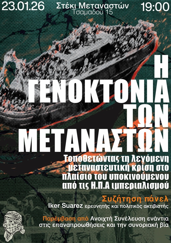 🔴 On 23/1 at Steki Metanaston (Tsamadou 15) we are honored to announce that Iker Suarez will present his thesis in-person. The Open Assembly Against Pushbacks and Border Violence will intervene in tying his theoretical contributions to the Greek context.