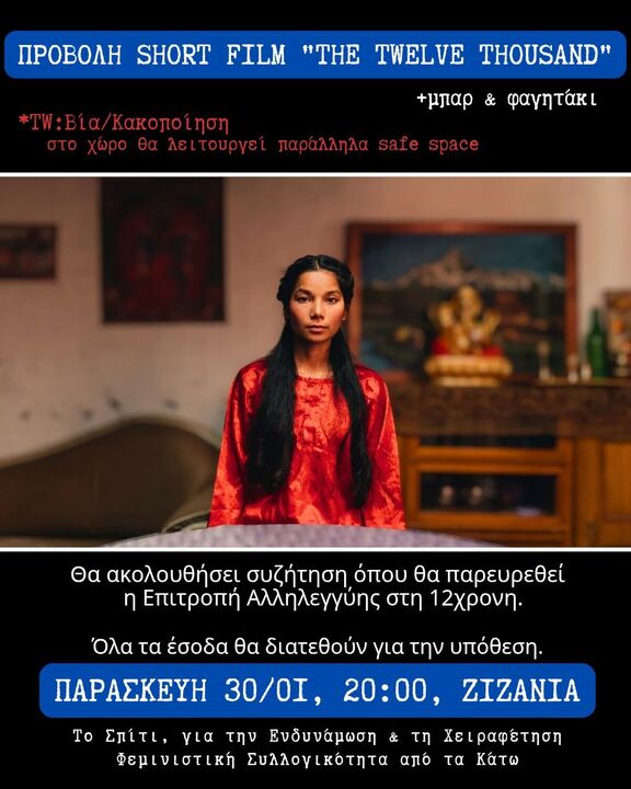 Θα ακολουθήσει συζήτηση στην οποία θα παραβρεθεί η Επιτροπή Αλληλεγγύης στη 12χρονη. Όλα τα έσοδα θα διατεθούν για την υπόθεση της 12χρονης.