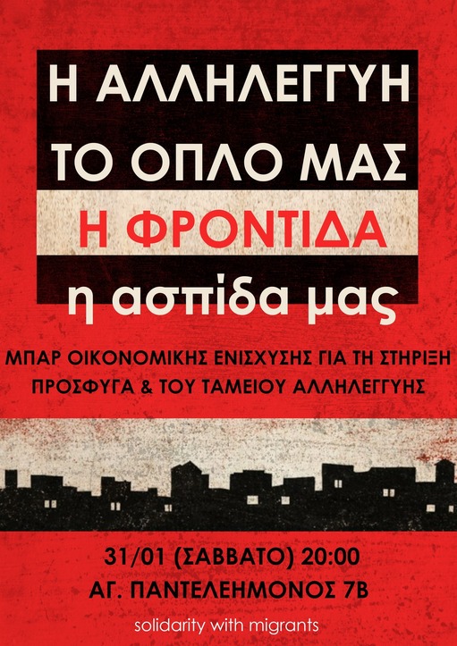 Αυτό το Σάββατο 31/01, διοργανώνουμε bar οικονομικής ενίσχυσης για τη στήριξη πρόσφυγα & φίλου και του ταμείου αλληλεγγύης της συνέλευσής μας, στο χώρο μας στην οδό Αγ. Παντελεήμονα 7β, κοντά στην πλατεία Αγίου Παντελεήμονα . Ξεκινάμε τη βραδιά μας στις 20:00 με μουσική, ποτά και φαγητό.