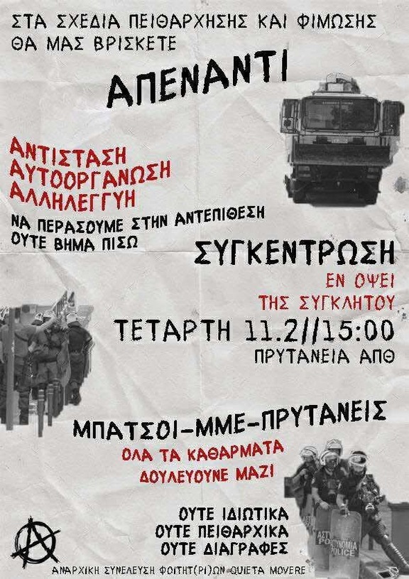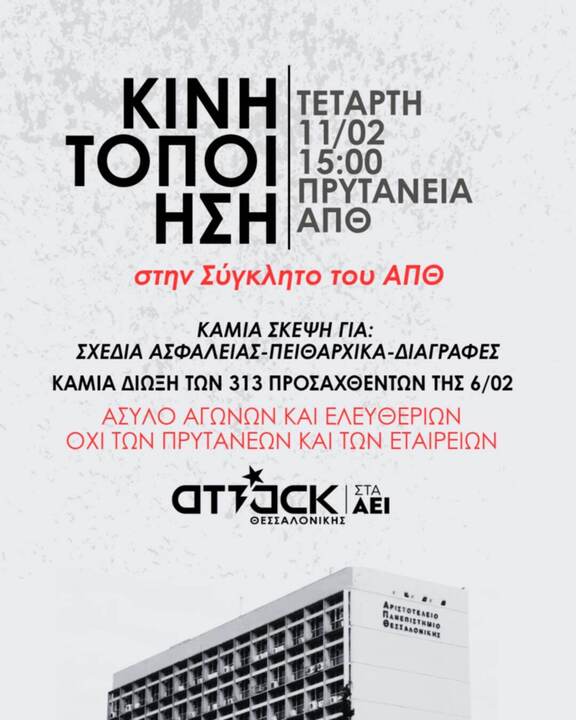 Όλοι/ες/α στην συγκέντρωση εν όψει της συγκλήτου την Τετάρτη 11/2 στις 15:00 στην Πρυτανεία του ΑΠΘ