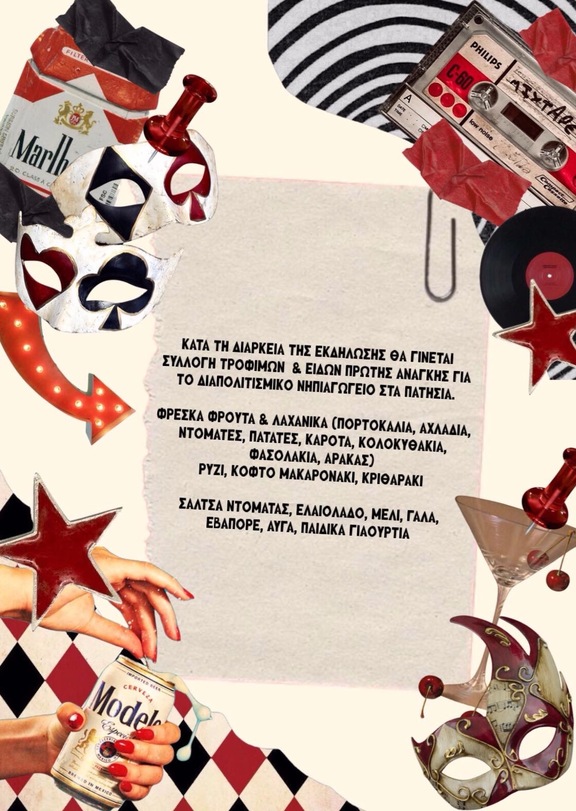 *Κατά τη διάρκεια της εκδήλωσης θα γίνεται συλλογή τροφίμων & ειδών πρώτης ανάγκης για το διαπολιτισμικό νηπιαγωγείο στα Πατήσια.
