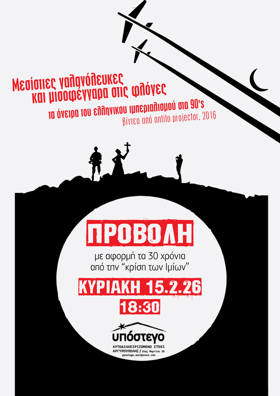 Προβολή «Μεσίστιες γαλανόλευκες και µισοφέγγαρα στις φλόγες - τα όνειρα του ελληνικου ιµπεριαλισµού στα 90's» (Συλλογή, επεξεργασία & επιμέλεια υλικού από τη συνέλευση Antifa Projector, 2016) με αφορμή τα 30 χρόνια από την «κρίση των Ιμίων».