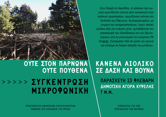 Στον Κοσμά της Αρκαδίας, οι κάτοικοι του χωριού αγωνίζονται ενάντια στην κατασκευή ενός αιολικού εργοστασίου, αγωνίζονται ενάντια στην λεηλασία του Πάρνωνα. Αυτοοργανωμένα, με επιμονή και αποφασιστικότητα, έχουν στήσει μπλόκο εδώ και ενάμιση μήνα, εμποδίζοντας την καταστροφή του ελατοδάσους και των βουνοκορφών από τα μηχανήματα της εταιρείας CNI Energy. Στεκόμαστε πλάι σε αυτόν τον αγώνα και καλούμε σε διαρκή στήριξη του μπλόκου.