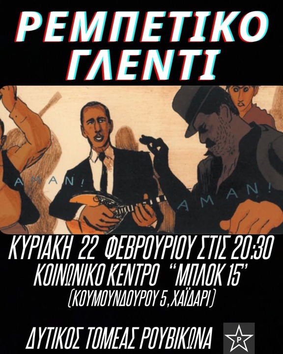 Ρεμπέτικο γλέντι οικονομικής ενίσχυσης στο Κοινωνικό Κέντρο «Μπλοκ 15» στο Χαϊδάρι (Κουμουνδούρου 5)