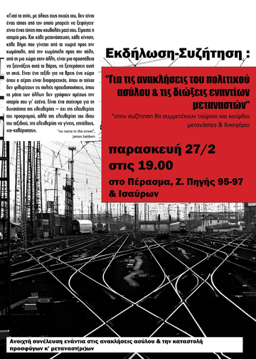 Την Παρασκευή 27/2 στις 19:00 στο πέρασμα (Ζ.Πηγής 95-97 & Ισαύρων) θα πραγματοποιηθεί εκδήλωση σχετικά με τις ανακλήσεις του πολιτικού ασύλου & τις διώξεις εναντίων μεταναστών. Στην συζήτηση θα συμμετέχουν Τούρκοι και Κούρδοι μετανάστες και Δικηγόροι.