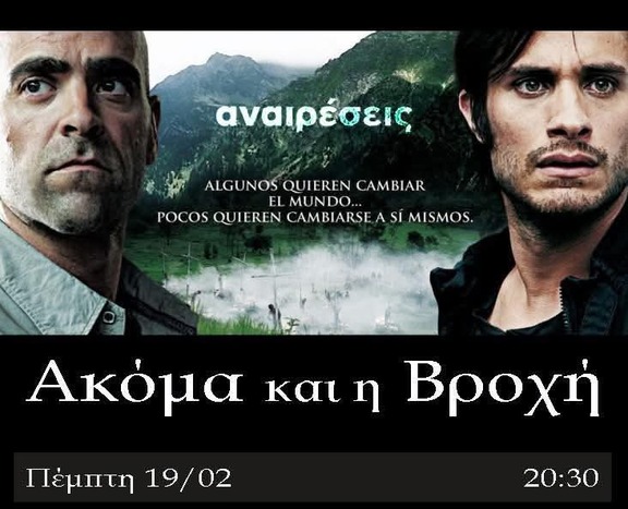 Εξαιρετικό πολιτικό δράμα που αφηγείται ταυτόχρονα δύο ιστορίες, με μια κίνηση κινηματογραφικής συγχώνευσης του ιστορικού μύθου του Κολόμβου και της σε πραγματικό χρόνο από πραγματικούς ανθρώπους εξέγερσης ενάντια στην ιδιωτικοποίηση του νερού στην Βολιβία το 2000. Οι αυτόχθονες κομπάρσοι υποδύονται στην ταινία μέσα στην ταινία που ετοιμάζουν ο Σεμπαστιαν και ο Κοστα τα θύματα της απληστίας του Κολόμβου για 2 δολάρια την ημέρα. Φεύγοντας από τα γυρίσματα δεν έχουν μάλλον άλλη επιλογή από το να εκθέσουν τα σώματα τους στην σφαγή από τον κυβερνητικό στρατό, που υπερασπίζεται την ιδιωτικοποίηση του νερού από την διεφθαρμένη φιλελεύθερη κυβέρνηση. Με μια κυκλική κίνηση η ιστορία επιστρέφει με «άλλα ρούχα» στην καταστατική συνθήκη των ταξικών κοινωνιών, την κοινωνική εκμετάλλευση και την αγριότητα των κοινωνικά κυρίαρχων. Την ίδια στιγμή οι ευρωπαίοι ως επί το πλείστον πρωταγωνιστές της ταινίας που φτιάχνει ο Σεμπαστιαν υποδύονται με παθιασμένο ιδεαλισμό τα δεινά των αυτόχθονων από τον Κολόμβο, αλλα στα πολιτικά και ηθικά διλήμματα που τους εμπλέκει η παρατήρηση σε πραγματικό χρόνο του αγώνα των φτωχών που συνεργάζονται στα γυρίσματα, κυριαρχεί η αμηχανία και η αποστασιοποίηση. Ακόμα και σε αυτούς τους ανθρώπους όμως οι μετακινήσεις στη συνείδηση προκύπτουν απότομα και ριζικά εκεί που δεν το περιμένεις…Το σενάριο της ταινίας της Ισίαρ Μπολειν υπογράφει ο σεναριογράφος του Κεν Λοουτς, Πολ Λαβερτι. Άρτια αισθητικά κινηματογραφική γραφή, με έξοχες ερμηνείες, πολυεπίπεδους χαρακτήρες και έξυπνη σεναριακή πλοκή το "Ακόμα και η Βροχή" αξίζει την προσοχή μας ακόμα και σήμερα, ίσως ακόμα περισσότερο στις μέρες μας. Μην τη χάσετε!