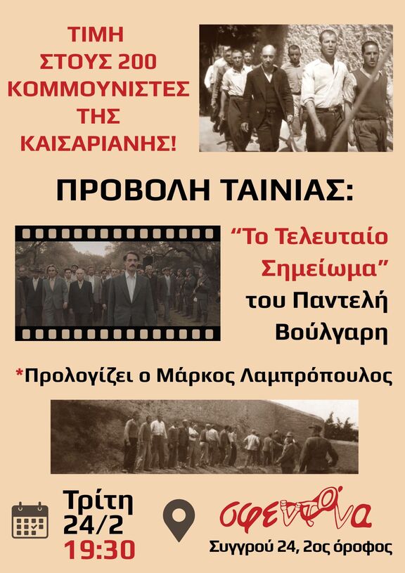 Με αφορμή τα ντοκουμέντα από την εκτέλεση των 200 κομμουνιστών στο σκοπευτήριο της Καισαριανής, προβάλουμε αυτήν την Τρίτη 24/2 στις 19:30 στη Σφεντόνα την ταινία "Το τελευταίο σημείωμα" του Παντελή Βούλγαρη.
