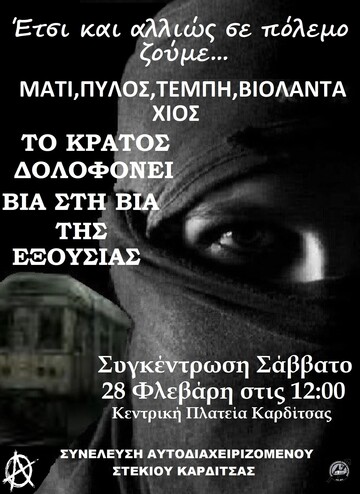 Το Σάββατο 28 Φλεβάρη συγκέντρωση / πορεία για το κρατικό καπιταλιστικό έγκλημα στα Τέμπη στις 12:00 Κεντρική Πλατεία Καρδίτσας.