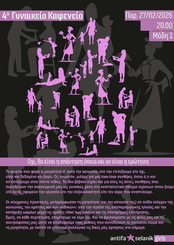 Οι σύγχρονες προσταγές μεταμόρφωσαν τη μητρότητα (και την απουσία της) σε πεδίο ελέγχου της κοινωνίας, του κράτους και των «ειδικών»: από την πρέσα της αναπαραγωγικής ηλικίας και την κατάψυξη ωαρίων μέχρι τις ομάδες Viber γονέων και τις πλατφόρμες επιτήρησης. Εμείς, σε κάθε περίπτωση, επιμένουμε να λέμε όχι. Και να βρισκόμαστε με τις φίλες μας και τις συντροφισσές μας ώστε να αποδομούμε τους μύθους που συνοδεύουν το γυναικείο σώμα και τη μητρότητα, με σκοπό να χτίσουμε συλλογικά τις δικές μας αρνήσεις στο σήμερα.