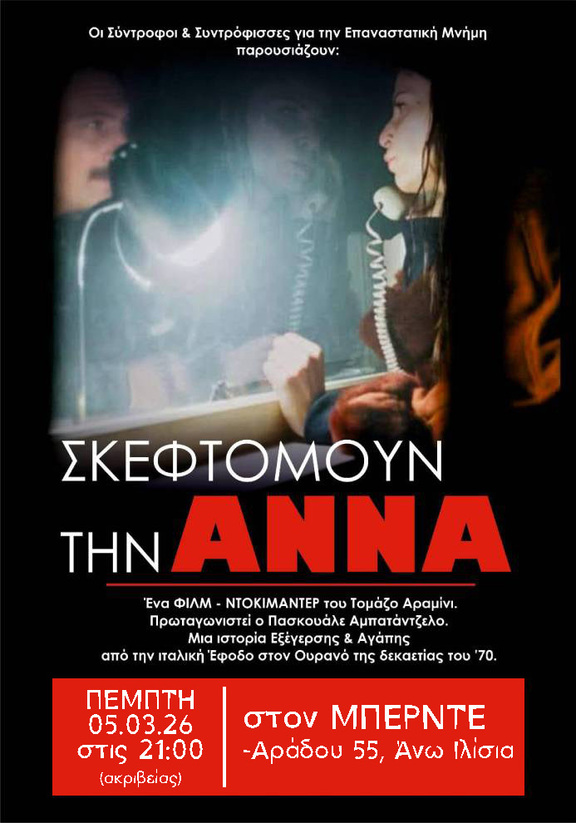 Αυτήν την Πέμπτη 5/3 στις 21:00 ακριβείας, σε συνεργασία με την ομάδα προβολών του Μπερντέ (Αράδου 55), θα πραγματοποιηθεί η προβολή του ντοκιμαντέρ «ΣΚΕΦΤΟΜΟΥΝ ΤΗΝ ΑΝΝΑ», ένα φιλμ - ντοκιμαντέρ του Τομάζο Αραμίνι.