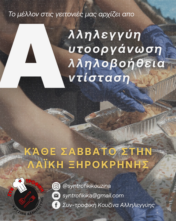 After so many years of crises, we all have to realize that there are no magic, instant or grand solutions. In this situation, where very large parts of the population are now facing problems with surviving, we have two clear options: either we will continue in a downward spiral that can only lead to greater exploitation, dependence and strife, or we will have to understand that there is no savior for us : we only have each other. In the face of government policies that divide, hurt, exploit and search for scapegoats to blame, we unite for active solidarity and mutual support. Not charity or philanthropy, but hands that pull up one another, not distinguishing between race, gender, religion. We fight poverty and division, by uniting in solidarity. Against a state and an economic system that wants us alone and fighting every day for survival, every solidarity structure is a spark of resistance. Such a spark is the one we are trying to ignite by organizing an open solidarity kitchen at the west part of Thessaloniki, where poverty and misery are more than everyday life: it is the future that awaits us all. We cook collectively, we eat collectively, we support each other, we give a hand to stand up together and we organize our resistances.