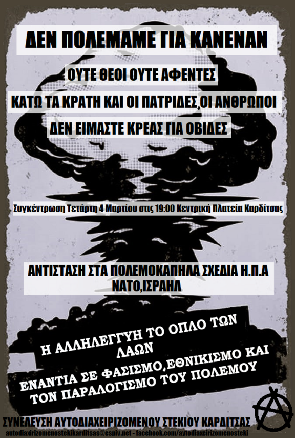 Αντιπολεμική συγκέντρωση Τετάρτη 4 Μαρτίου στην κεντρική πλατεία Καρδίτσας στις 19.00 .