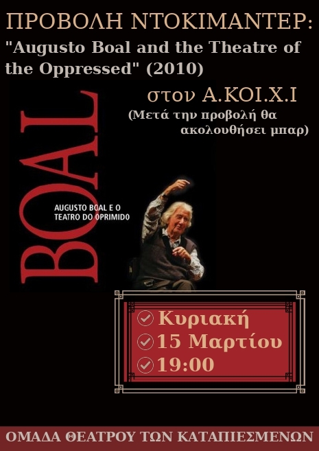 Την Κυριακή 15 Μαρτίου 2026, στις 7μ.μ., η Ομάδα Θεάτρου των Καταπιεσμένων των Ιωαννίνων θα προβάλει το ντοκιμαντέρ "Augusto Boal and the Theatre of the Oppressed" (2010), στον Α.Κοι.Χ.Ι. Το ντοκιμαντέρ είναι με αγγλικούς υπότιτλους και διαρκεί 62΄.