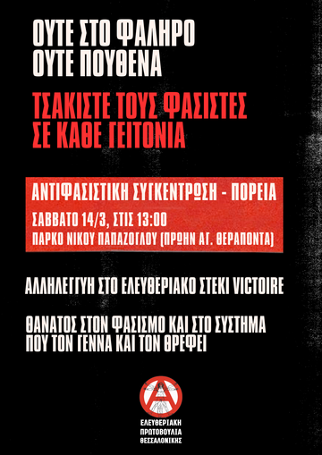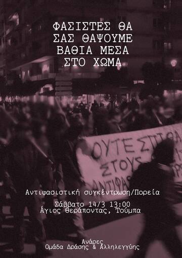 Στηρίζουμε την Αντιφασιστική Συγκέντρωση - Πορεία, Σάββατο 14/3 13:00 Άγιος Θεράποντας, Τούμπα