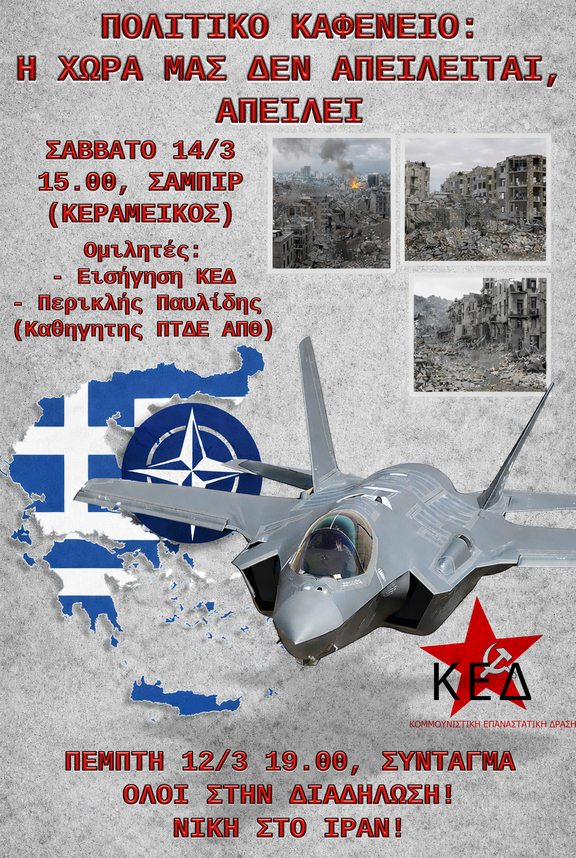 Φυσικά, σε αυτή τη σάπια χορωδία δεν έλειψε και η συμμετοχή της Ελλάδας, που προθύμως έστειλε και αυτή στρατό στην Κύπρο. Αυτή λοιπόν η "κακομοίρα και εξαρτημένη" μπανανία ξαφνικά εγκαταλείπει τα μπαλωμένα της παλιόρουχα και μοστράρει τη δύναμη της νέας "υπερσύγχρονης" φρεγάτας της. Πλάι στην υπόλοιπη πρωτοκοσμική της συμμορία έρχεται να συμβάλει και αυτή ως θύτης, στηρίζοντας άμεσα, πλέον, τις επιχειρήσεις ΗΠΑ και Ισραήλ. Η ελληνική άρχουσα τάξη λέει, λοιπόν, ότι η πατρίδα, η Κύπρος και συνολικά ο Ελληνισμός απειλούνται. Έτσι επιχειρούν να διαχύσουν εθνικιστικό δηλητήριο στον κόσμο, μπας και μπορέσουν να τους στείλουν κάποτε και στο μέτωπο. Η επιδίωξή τους είναι να συμβάλει και η πατρίδα μας σε φόνους και καταστροφές, ακόμα και αν αυτό σημαίνει φέρετρα με την ελληνική σημαία. Άλλωστε, πάντοτε έτσι πορευόταν ο ελληνικός καπιταλισμός: μέσω τυχοδιωκτικών πολεμικών κινήσεων (Μικρασιατική Εκστρατεία, Ίμια, Κυπριακό, Ελληνοτουρκικός πόλεμος 1897), με έμπνευση από Μεγάλες Ιδέες και λειτουργώντας ως μία από τις αιχμηρές λόγχες του Ιμπεριαλισμού. Και έτσι από "γκαρσόνια της Ευρώπης" μετατρεπόμαστε σε Ράμπο έτοιμοι να θυσιαστούμε για τα συμφέροντα των Λάτσηδων και των Βαρδινογιάννηδων της πατρίδας μας.