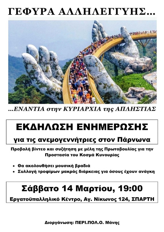 Ο ΠΕΡΙ.ΠΟΛ.Ο. Μάνης σας προσκαλεί σε ενημερωτική εκδήλωση για τον αγώνα ενάντια στην εγκατάσταση βιομηχανικών αιολικών σταθμών στον Πάρνωνα.