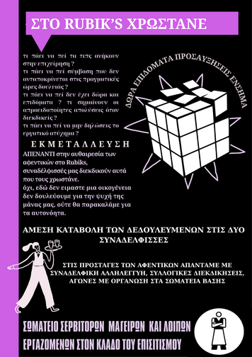 Rubik's: ένα μαγαζί με προσωπείο μη ιεραρχικού χαρακτήρα και εναλλακτισμού - ένα ακόμα μαγαζί στις πιάτσες της πόλης όπου η εργασιακή εκμετάλλευση δεν έχει τέλος. Δύο συναδέλφισσες μας, μέλη του Σωματείου, κατήγγειλαν τις συνθήκες εργασίας: υποασφάλιση, σπάσιμο του οχταώρου σε τέταρτα, κουτσουρεμένα δώρα και επιδόματα, υποστελέχωση και πολλαπλά πόστα σε σταθερή βάση. Ακόμη, η διαχείριση των τιπς γίνεται από τα αφεντικά που κάνουν το μοίρασμα στο τέλος του μήνα, με όποιο κριτήριο αυτοί θέλουν.