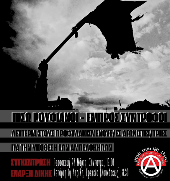 Για την έναρξη της δίκης της υπόθεσης των Αμπελοκήπων Συγκέντρωση Αλληλεγγύης Παρασκευή 27/3, 8μμ Σύνταγμα. Μικροφωνική Συγκέντρωση Αλληλεγγύης Κυριακή 29/3, 12.30 Πεδίο του Άρεως (πάνω μεριά του πάρκου). Συγκέντρωση Αλληλεγγύης Τετάρτη 1 Απριλίου, 08:30, Εφετείο Λουκάρεως