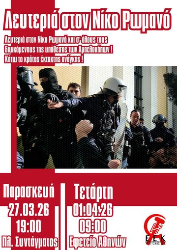 Την 1η Απριλίου 2026, μετά από σχεδόν δύο χρόνια προφυλάκισης του αγωνιστή Νίκου Ρωμανού και άλλων συντρόφων για την υπόθεση των Αμπελοκήπων, πρόκειται να ξεκινήσει η διαδικασία εκδίκασης της υπόθεσης. Σε μια περίοδο υπερσκανδάλων, πολεμικής προετοιμασίας και εμπλοκής του ελληνικού κράτους στη γενοκτονία στην Παλαιστίνη, με την πιο λαομίσητη κυβέρνηση αντεργατικής πολιτικής και σκανδάλων, των φραπεδων, των υποκλοπών, των αλλεπάλληλων κρατικών δολοφονιών στα Τέμπη, την Πύλο και την Βιολάντα, ως τις εκατοντάδες εργοδοτικές δολοφονίες εν ώρα εργασίας, το Ελληνικό κράτος ξεδιατροπα κρατάει όμηρο τον Νίκο Ρωμανό με τον ισχυρισμό ότι βρέθηκε ένα δαχτυλικο του αποτύπωμα σε ένα φορητό μέσο, στα απομεινάρια μιας σακούλας, μέσα στο καταστραμμένα κτίριο της έκρηξης στους Αμπελόκηπους.