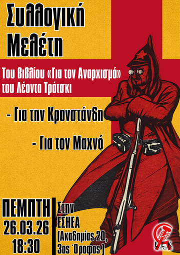 Την Πέμπτη 26 Μαρτίου, 18:30 στην ΕΣΗΕΑ (Ακαδημίας 20, 3ος Όροφος) η οργάνωση Κέντρου- Πατησίων-Κυψέλης του Εργατικού Επαναστατικού Κόμματος, συνεχίζοντας τους κύκλους συλλογικής ανάγνωσης και μελέτης θα πραγματοποιήσει μία νέα συζήτηση, αυτην την φορά πάνω στα επιλεγμένα κείμενα του Λέοντα Τρότσκι για τον αναρχισμό, το κίνημα του Μαχνό και την καταστολή της εξέγερσης της Κροστάνδης μαζί με κάποια επιλεγμένα στρατιωτικά κείμενα για τον κόκκινο στρατό που αφορούσαν τα σχετικά γεγονότα.