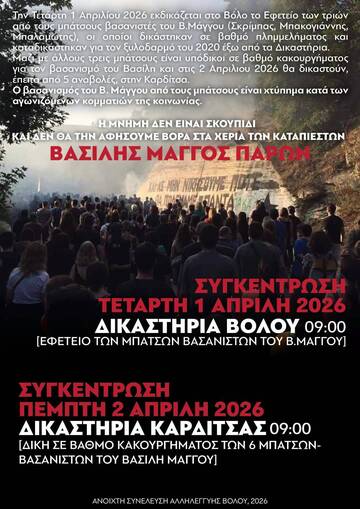 Την Πέμπτη 02 Απριλίου ορίστηκε από το κακουργιοδικείο Καρδίτσας να ξεκινήσει η δίκη σε βαθμό κακουργήματος για τους 6 μπάτσους που εμπλέκονται στο βασανισμό του Βασίλη Μάγγου, τόσο έξω από τα δικαστήρια του Βόλου τον Ιούνη του 2020, όσο και στην Αστυνομική διεύθυνση Μαγνησίας. Είναι η 6η "απόπειρα" να ξεκινήσει η εν λόγω δίκη, καθώς από τον Ιούνιο του 2025 έχουν μεσολαβήσει 5 αναβολές, όλες μεθοδευμένες από τούς δικηγόρους υπεράσπισης των βασανιστών.