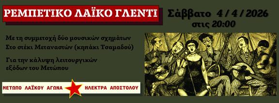 Σας προσκαλούμε στο ρεμπέτικο λαϊκό γλέντι, θα πραγματοποιηθεί το Σάββατο 4/4/2026 στις 20:00, με ζωντανή μουσική από δύο μουσικά σχήματα, στον εξωτερικό χώρο του Στεκιού Μεταναστών (Τσαμαδού 15, Εξάρχεια).